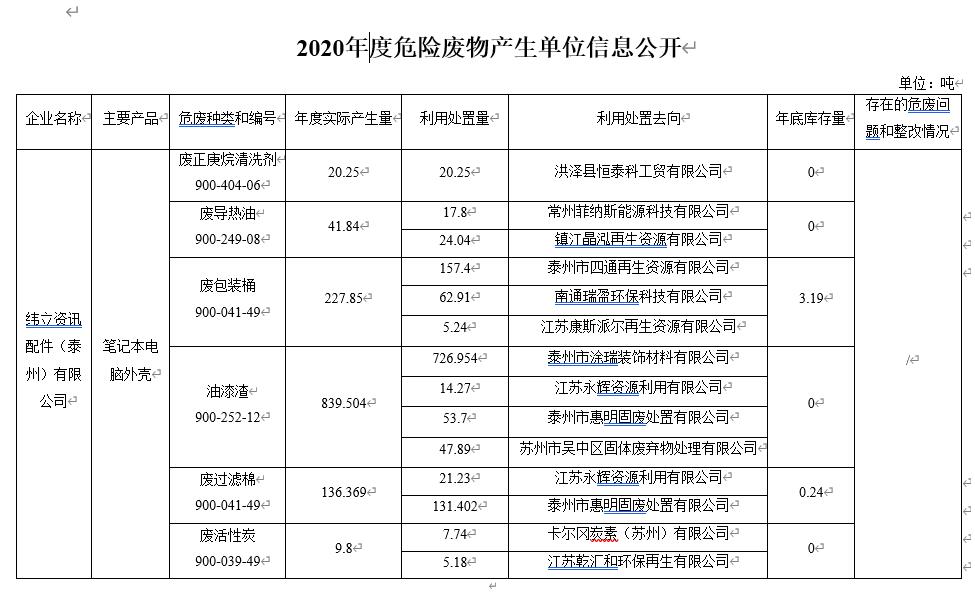 項目公示 | 緯立資訊配件(泰州)有限公司2020年度危險廢物信息公開
